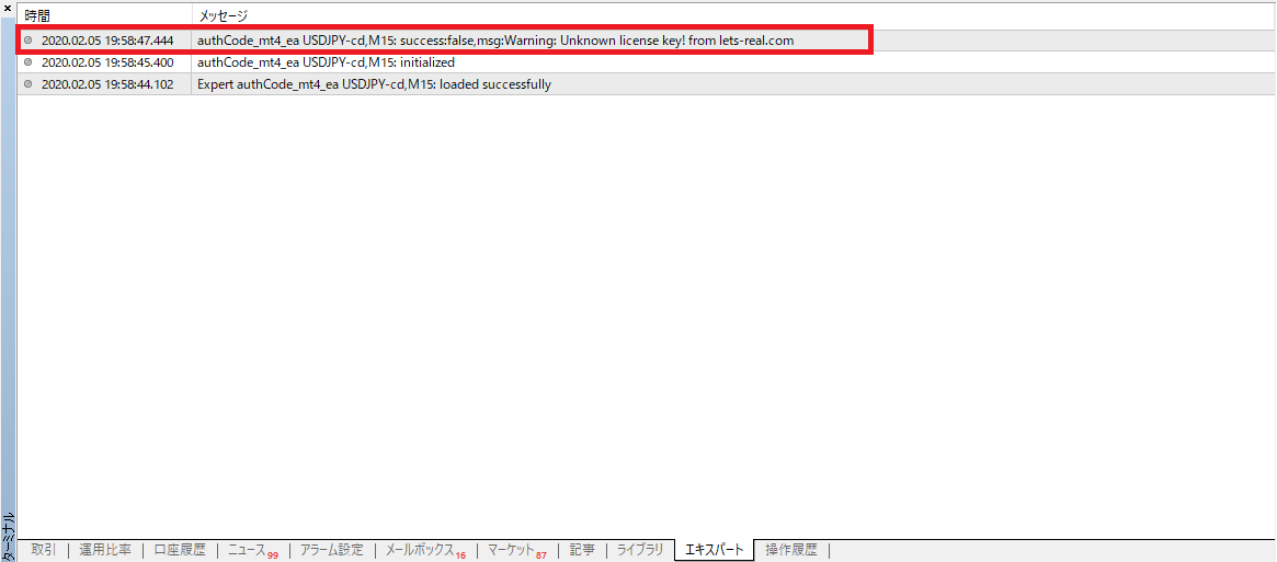 リリースされないと認証は失敗されるので、一定の間隔で同じメッセージが出てきます。つきまして、メッセージが確認できましたら、EAを外してください。