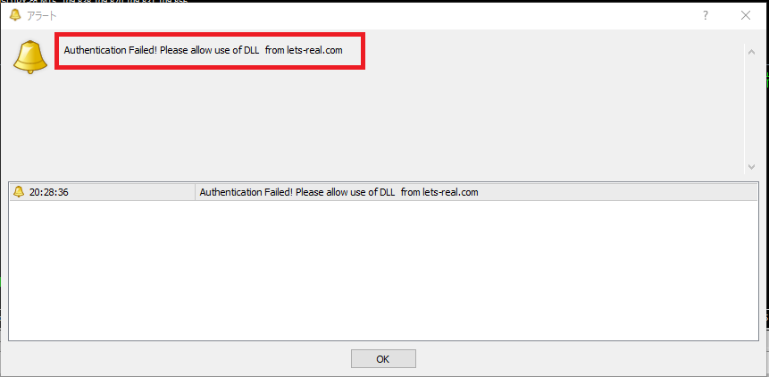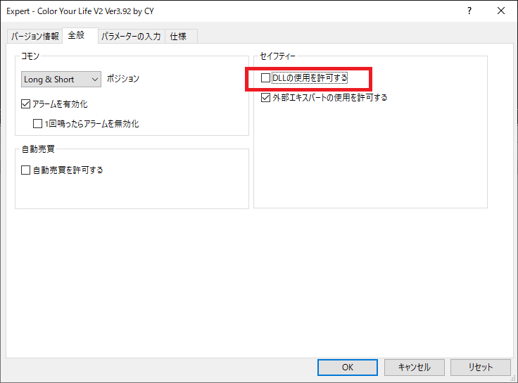 1、認証コードを実装されているEAをチャートに設定し、「DLLの使用を許可」のチェックをあえて外してみます。