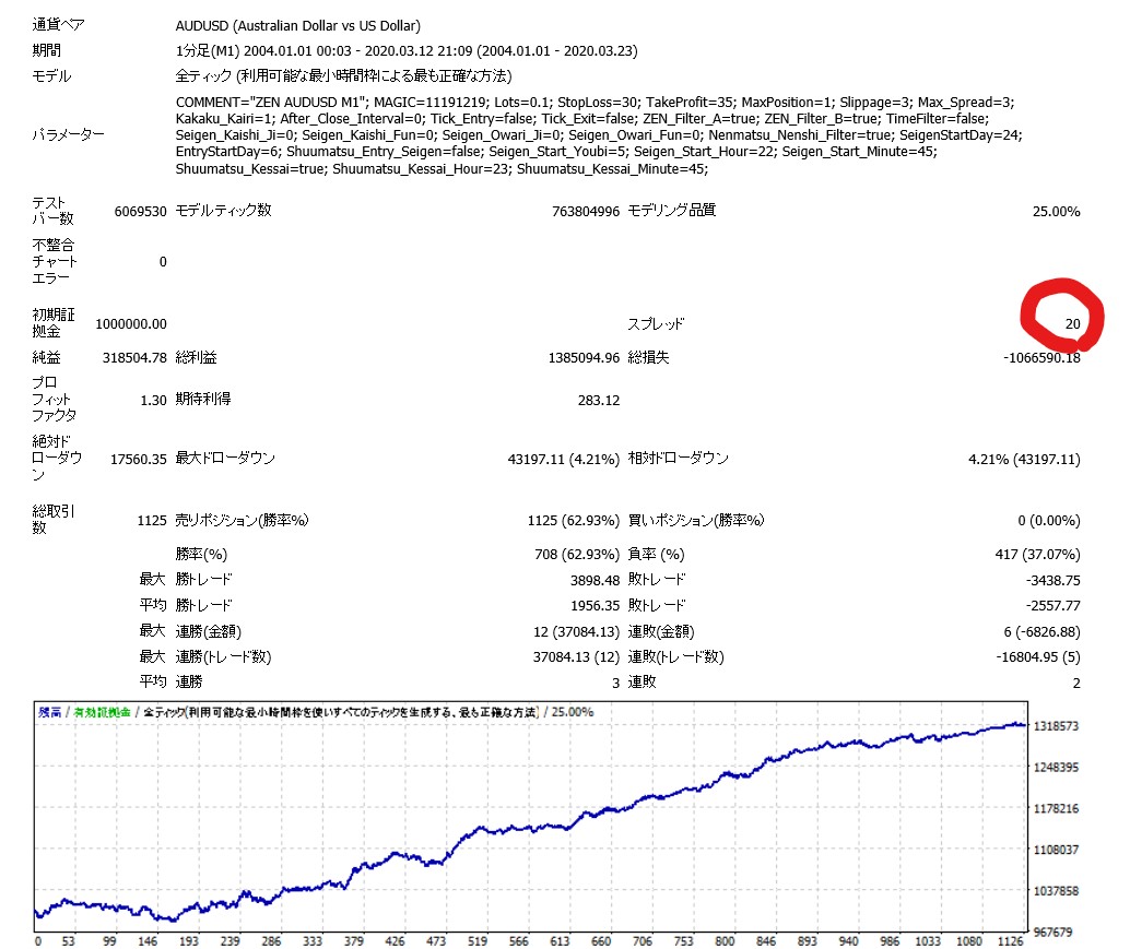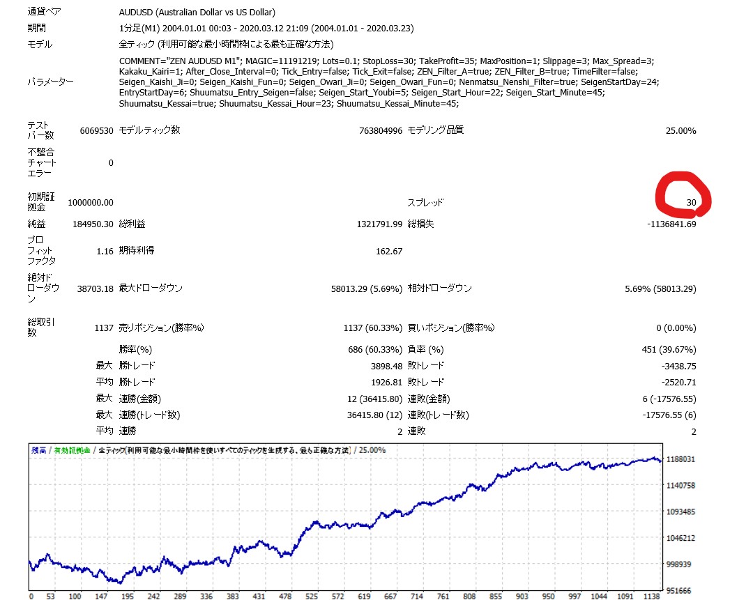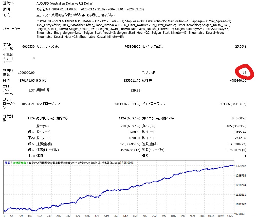 スプレッド1.5のバックテストを見てみると、勝率は約64%と高くないですが、リスクリワードレシオ(平均勝ちトレード÷平均負けトレード)は約0.77と高い数値となっています。