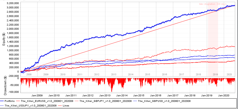 ・複数通貨ペアのポートフォリオを組むことにより、利益の最大化および最大ドローダウンの低下を行っています。