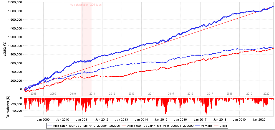 ・2通貨ペアのポートフォリオを組むことにより、利益の最大化および最大ドローダウンの低下を行っています。