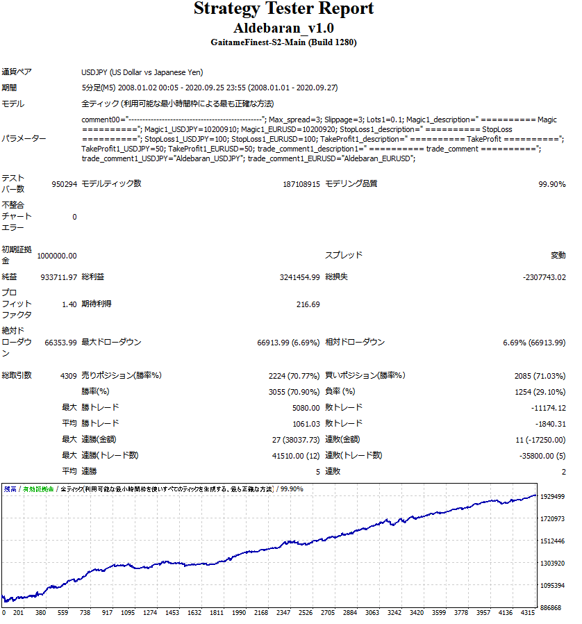 ・バックテストにTDS(Tick Data Suite)を使用しているため、通常のバックテスト(疑似ティック)に比べ、よりリアルの相場に近い環境でも優位性があることを確認しています。
