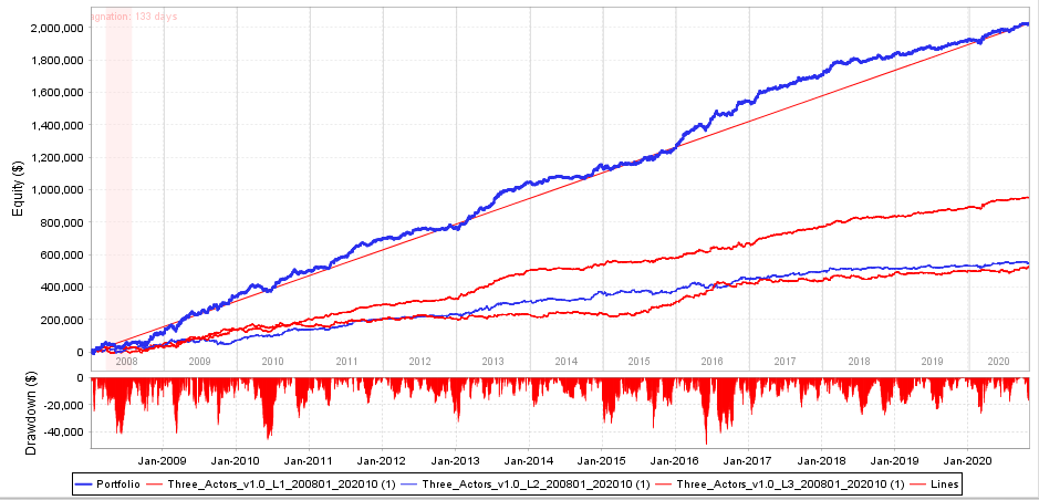 ・3ロジックのポートフォリオを組むことにより、利益の最大化および最大ドローダウンの低下を行っています。