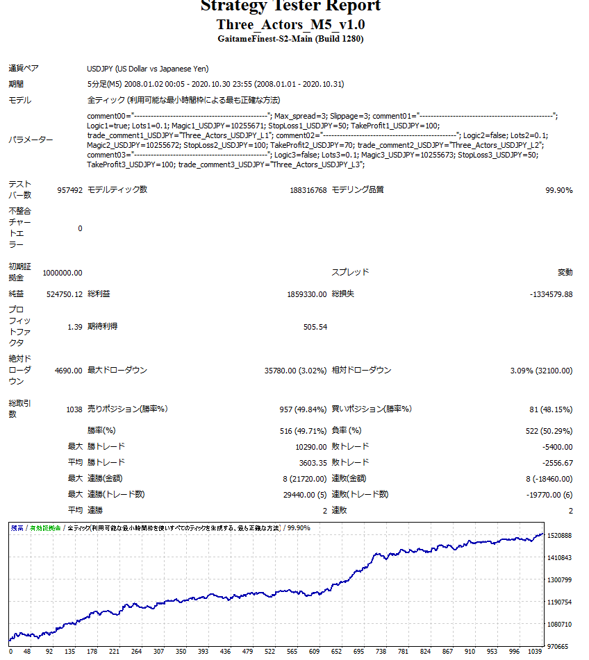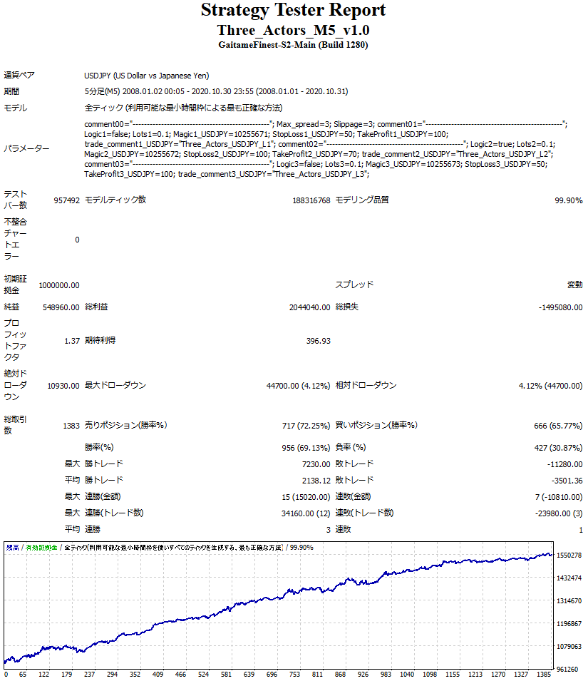 ・バックテストにTDS(Tick Data Suite)を使用しているため、通常のバックテスト(疑似ティック)に比べ、よりリアルの相場に近い環境でも優位性があることを確認しています。