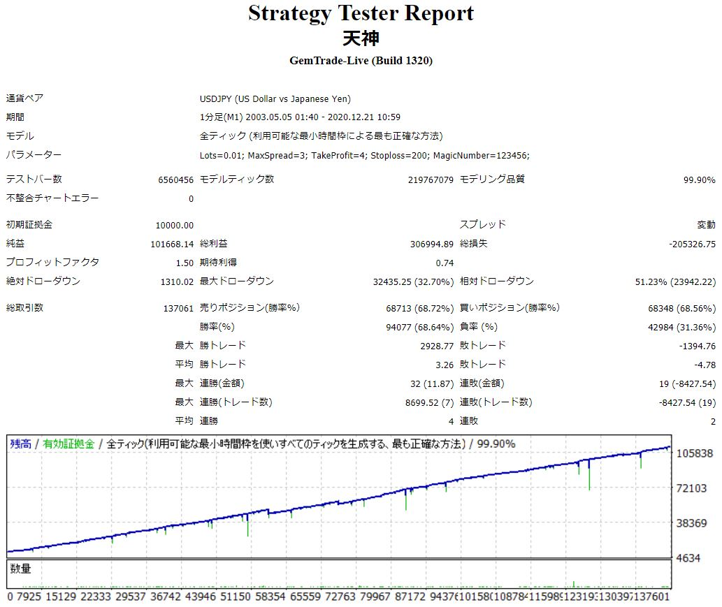 ナンピンマーチンゲールロジックを採用しているEAでありながらも、最大ドローダウンは32.7%と低ドローダウン化を実現。