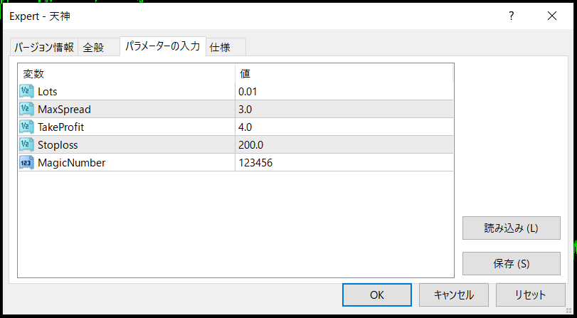 MaxSpread:スプレッドフィルターです。ここで指定した値以上にスプレッドが拡がっている場合は新規注文を行いません。