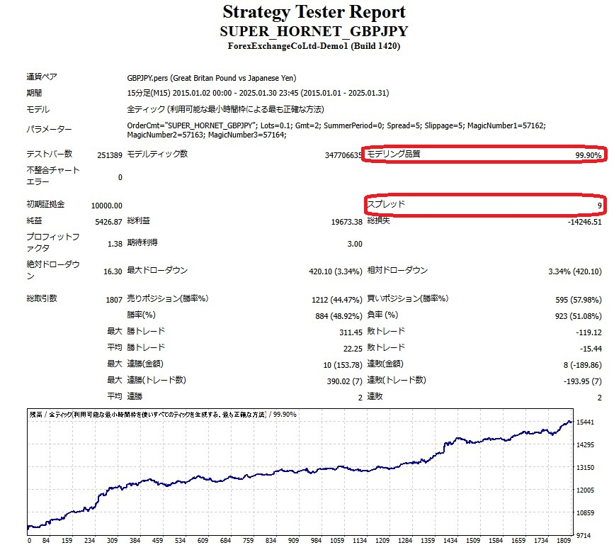 手元でバックテストを取られる際は、実際にご利用される証券会社の環境に近い条件で実施していただけると幸いです、実施時はモデルのパラメータについては「全ティック」を選択してください。