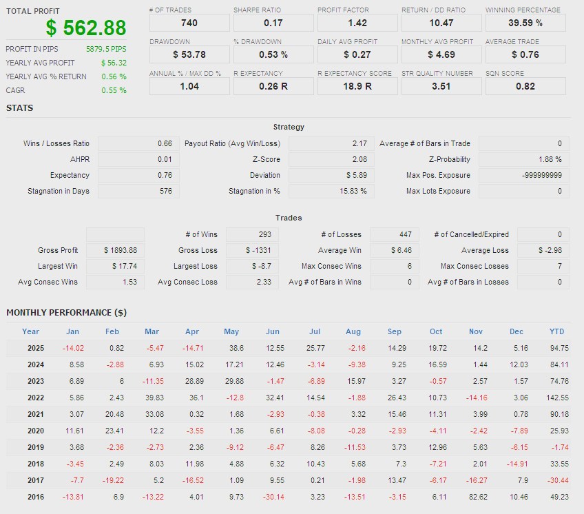 | 純利益 | +$562.88(固定0.01ロット運用) |