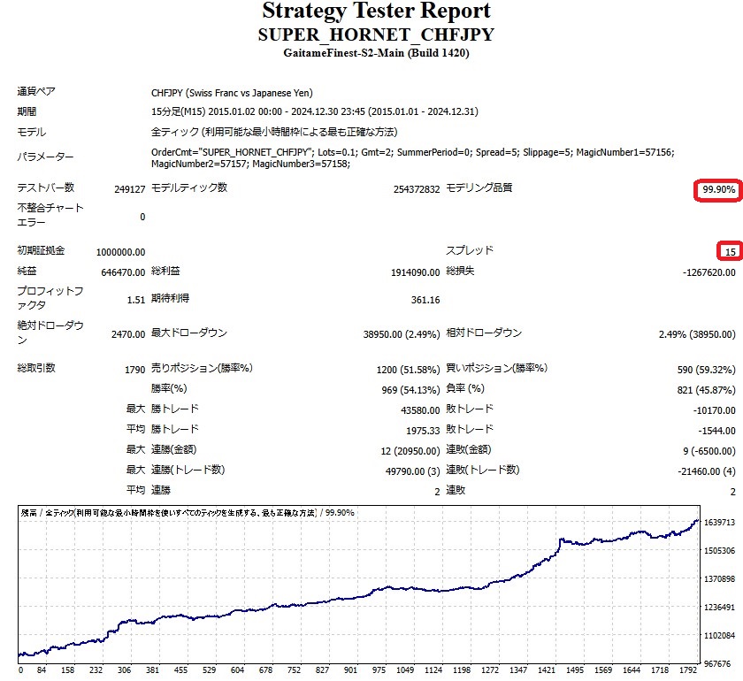 ヒストリカルデータはDukasCopy社のものを採用しています。スプレッドの設定は標準的な証券会社を参考にし、「15ポイント(1.5pips)」としました。