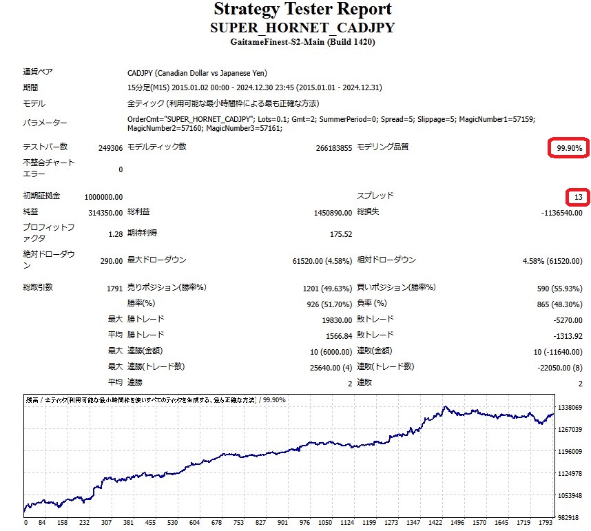 ヒストリカルデータはDukasCopy社のものを採用しています。スプレッドの設定は標準的な証券会社を参考にし、「13ポイント(1.3pips)」としました。